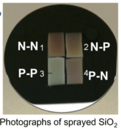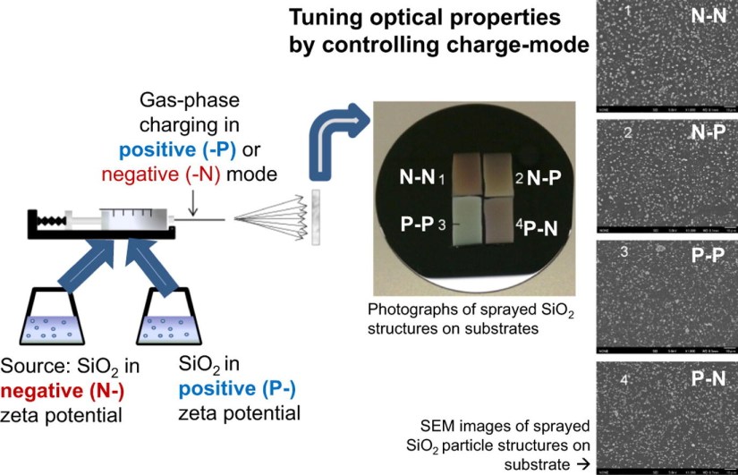 Colloidal (silica) nanoparticles having negative and positive zeta potential were subjected to electrospray in both negative and positive mode, and deposited on a substrate (silicon wafer). Visual observation of the substrate with particle deposition shows various white shades, corresponding to the changes in optical properties, as supported by the ultraviolet-visible–near-infrared spectroscopy. Microscopic analysis revealed the strong correlation between the colloid surface charge and charging mode (positive or negative) of the sprayed droplets to the particle morphology and size. 負および正のゼータ電位を有するコロイダルナノ粒子を、負および正モードの両方で静電噴霧により基板(シリコン)上に堆積させた。操作条件を変えると、粒子が付着した基板の光学特性(紫外‐可視‐近赤外分光法)に様々な変化が見られた。顕微鏡の観察からは、粒子形態とサイズに対する液滴のコロイド表面電荷と帯電モード(正または負)の間の強い相関を明らかにした。