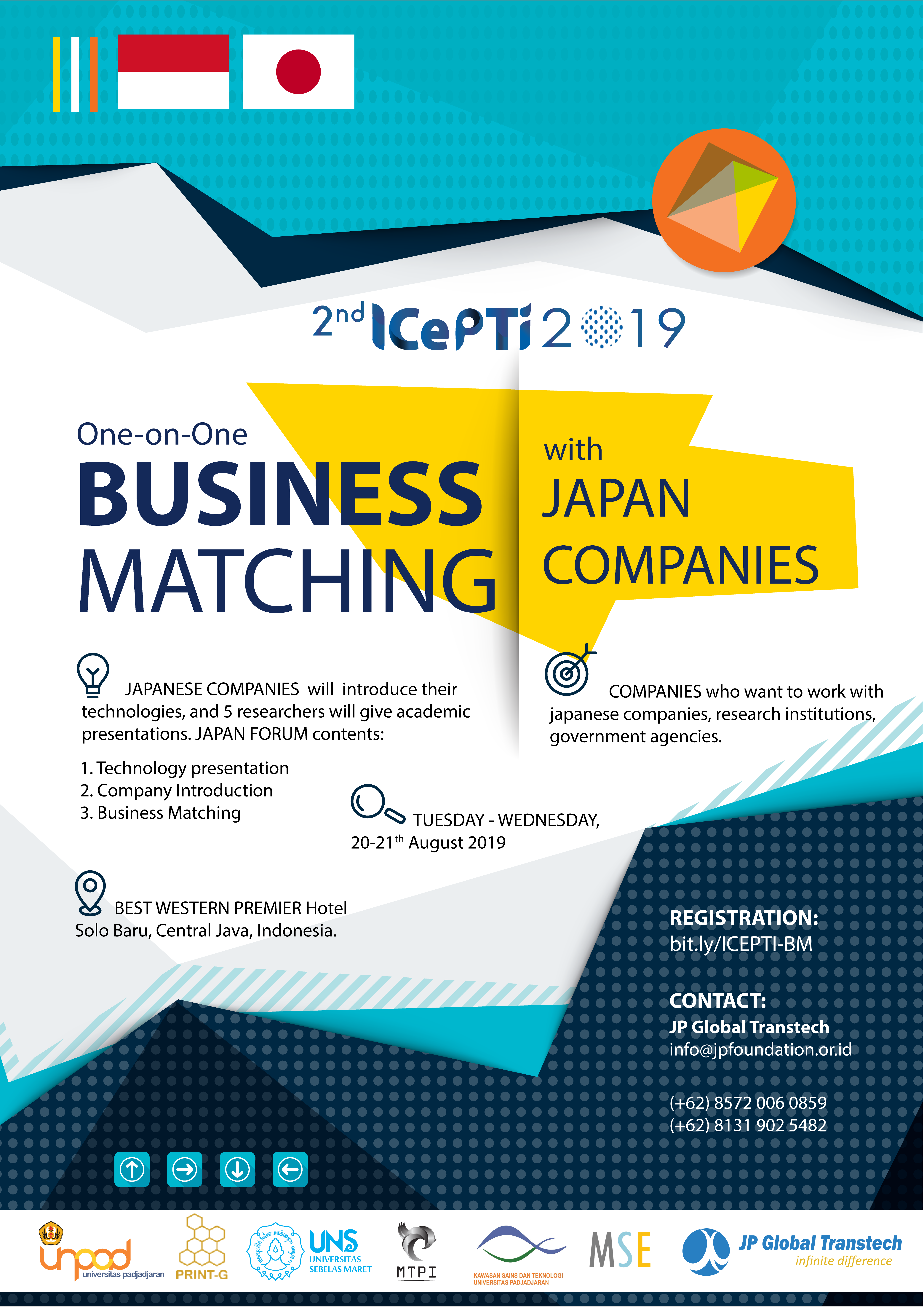 UNS大学農学部(Food Science and Technologyプログラム・食品化学および生化学研究室)は、2019年8月20-21日、Best Western Premier Hotel Solo Baruで開催された、2019年第2回 Powder Technology Indonesia に関する国際会議および展示会(ICePTI)を開催しました。UNSとパジャジャラン大学UNPAD、JP Global Transtechが主催するICePTi 2019では、インドネシア粉体技術学会(MTSI)の設立、国際セミナー、粉体特性評価のための分析ワークショップ、国際出版物のための科学執筆ワークショップ、粉末の製造に従事している日本企業との1対1のビジネスマッチングなどの重要なイベントがあります。5か国(インドネシア、日本、インド、タイ、台湾)からの24人の招待スピーカーも含め、研究者および技術者が国際セミナーに参加しました。