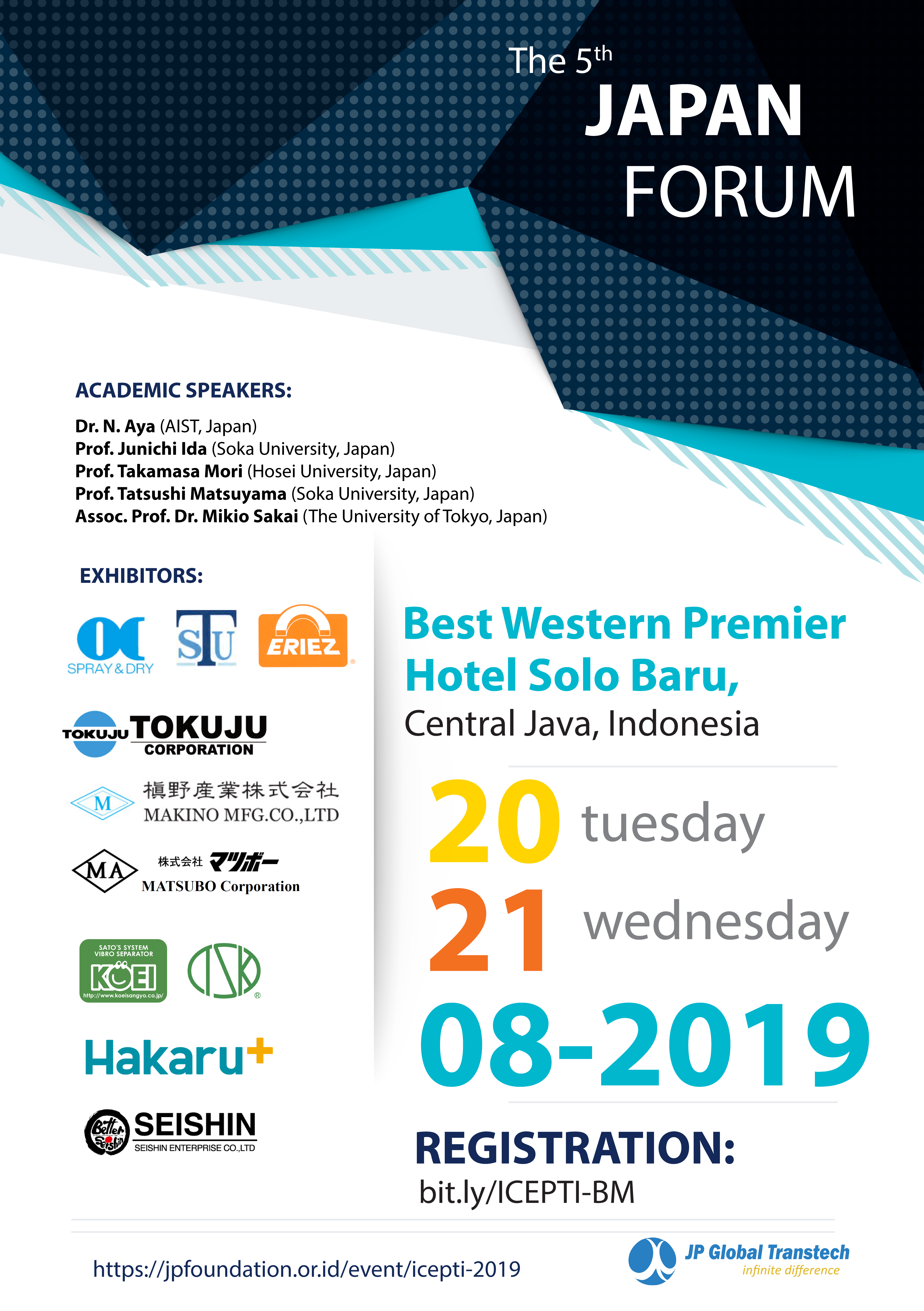 当イベントについてインドネシアの新聞記事(2019/8/20)の翻訳Pakar Teknologi Serbuk Asal 5 Negara Hadiri Icepti 2019粉体技術の開発は、科学分野のさまざまな分野に浸透しています。 粉体テクノロジーの研究、技術開発、応用を探求するため、パジャジャラン大学およびインドネシア 粉体テクノロジーソサエティ協会(MTSI)と共同で、セベラスマレット大学(UNS)は、第2回 インドネシア粉体テクノロジーに関する国際会議および展示会 (Icepti) を開催しました。 このイベントは、インドネシア、日本、インド、タイ、台湾の5か国から24人の研究者と粉末技術者が集まり、ベストウエスタンホテルで開催されました。 「研究結果と政府の政策の活用と産業開発の必要性との相乗効果による大学の役割は非常に重要です」と、2019年のIcepti委員委員長のDanar Praseptiangga博士は述べた。 Gadjah Mada大学のJagal Waseso教授(副学長、食品技術の専門家)は、粉末技術は農業を非常に支えていると述べました。それらの1つは、腐敗しやすく、流通が難しいことが知られている農産物の粉末技術の使用です。粉末技術を使用すると、農産物をより簡単に流通し、より耐久性のある形に変換することができ、経済的および機能的に多様な価値を付加できます。 「機能性食品は研究トレンドになりつつあります。 2019年のIceptiの開催により、機能性食品の開発をサポートできる多くの研究があることを願っています」と述べています。 農業だけでなく、粉末技術は鉱業部門にも有益です。鉱業製品からの一部の鉱物は、より簡単に配布される粉末の形で輸出できるように粉末技術で処理することもできます。 ナノテクノロジーの専門家であるProf. I Made Joniは、このイベントでは、粉末製造プロセスに携わるさまざまな地元企業と日本企業の潜在的なパートナーを集めることも期待されていたと付け加えた。 このイベントでは、日本の有力大学の5人の研究者と、関東地区ネットワーキンググループの粉体工学会に所属する10社の日本企業が優れた技術と製品を紹介します。