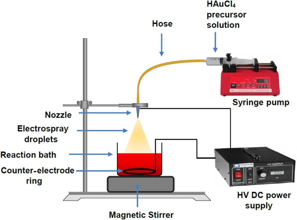 Gold (Au) nanoparticles were synthesized in an electrospray-assisted system via aerosols (mist) and liquid reactions. 金(Au)ナノ粒子は、エアロゾル(液滴群)と液相反応を介して静電噴霧システムで合成された。