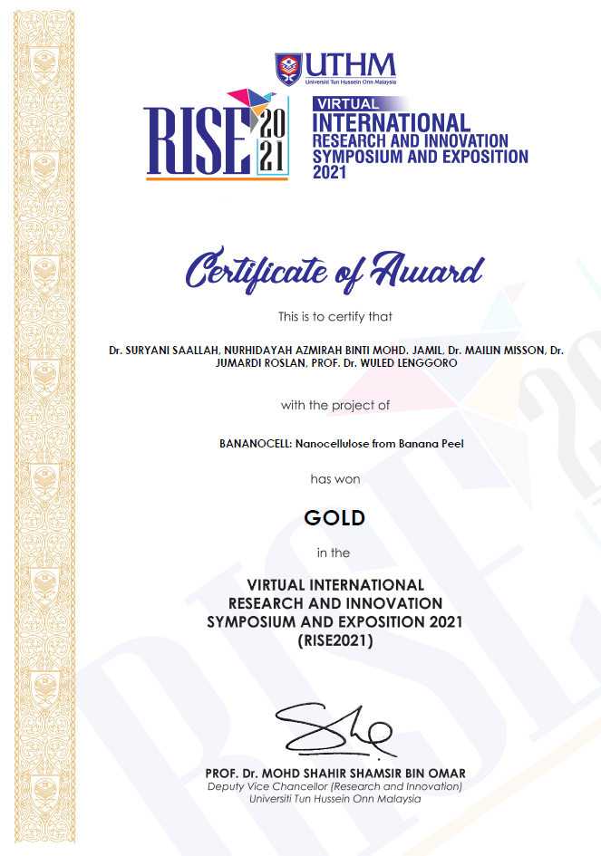 Gold Award in RISE2021: International Research and Innovation Symposium and Exposition (Hosted by Universiti Tun Hussein Onn Malaysia)