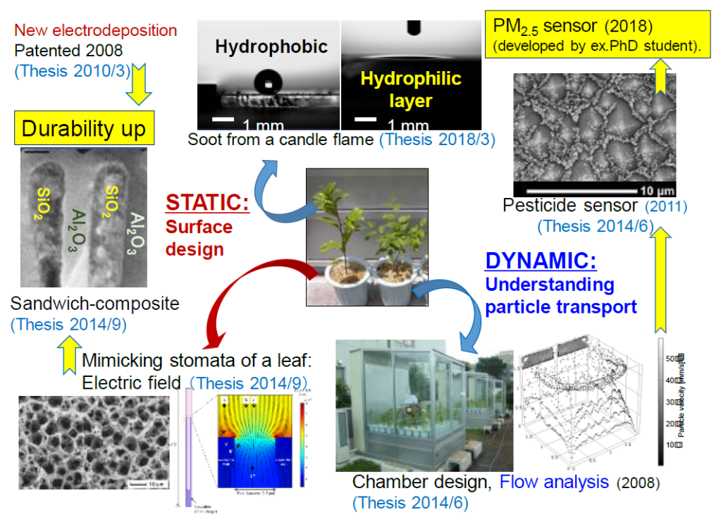 In 2006, I passed the selection for the first batch tenure-track program in Japan. When I started a research group at TUAT, I stopped all joint research with companies that had formed in the past and set a new direction. The turning point in my group’s target setting occurred in the first year. I co-initiated a project on “Particulates & Plants” (ASEPH, 2008-2013), together with colleagues at the school of agriculture. With graduate students, we designed a chamber for growing plants and realized that the “core” of the project was the plant, not the researchers. Daily experiments were performed for almost two years. The plants grew from 10 to 200 cm. Heterogeneous leaf surfaces and an air conditioned (24 h) chamber created “turbulence” points.