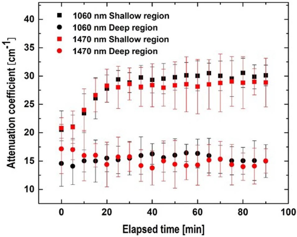 生体組織中の水分量の動態は、生物活性の重要な情報である。しかし、従来の測定法では組織に含まれる水分の総量を測定するが、生体組織に局在する水分量を定量的に測定する方法は確立されていない。2つの近赤外波長を用いたスペクトル領域光干渉断層計システム (SD‐OCT) を室温での蒸発の断面画像化と定量分析に応用するために開発した。光源の波長は、水にほとんど吸収されない1060 nmと、220倍吸収される1470 nmを選択した。本研究では、2波長OCTを用いて高密度媒質中の減衰係数に対する吸水・散乱の影響を調べ、光散乱による蒸発過程における水の動力学を測定する可能性を示した。実験の結果、高密度媒質中の減衰係数は吸水よりも散乱の影響を強く受けることが分かった。これらは、蒸発の過程で水素結合したセルロースとその周囲の自由水との屈折率整合効果の時間的変動による散乱の影響を強く受ける。SD-OCTは、これまで観測されたことのない自然現象を可視化し、定量的に分析するための非常に実用的で有用なツールであると結論付けられた。