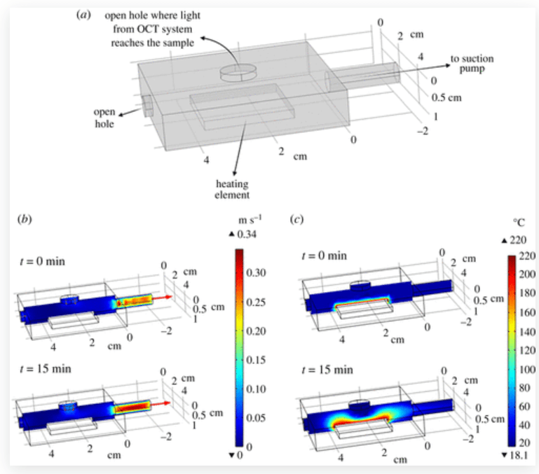 . (a) Geometry of the heating chamber, for heater temperature set at 200°C and suction velocity of 0.2 m s−1, (b) calculated velocity profile inside the chamber and (c) calculated temperature profile in the chamber after/before operating the suction-pump.s