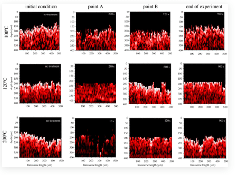 一方、バイオマスは、木材や農作物などの有機物質からなる燃料です。バイオマスを燃焼させるためには、バイオマス中の液体(水分)を蒸発させる必要があります。OCTを用いることで、バイオマス中の液体の蒸発挙動を観察することができます。
