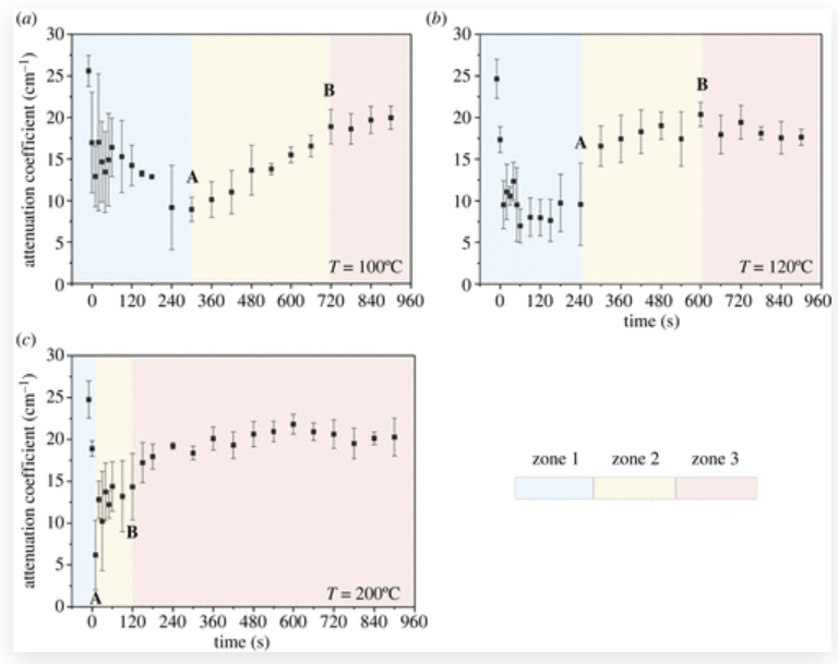 この研究では、OCTを用いて、多孔質タバコ基材中の高粘度液体(グリセリン、グリセロール)の加熱中の動態をモニタしました。その結果、液体挙動における2つの遷移点が観察されました。最初の遷移点は、浸透が支配的なゾーンが蒸発が支配的なゾーンに遷移する際の時間(近似)を示しています。2番目の遷移点は、自由液体の急速な蒸発が、トラップされ結合した液体のゆっくりとした蒸発に遷移する時間(近似)を示す。