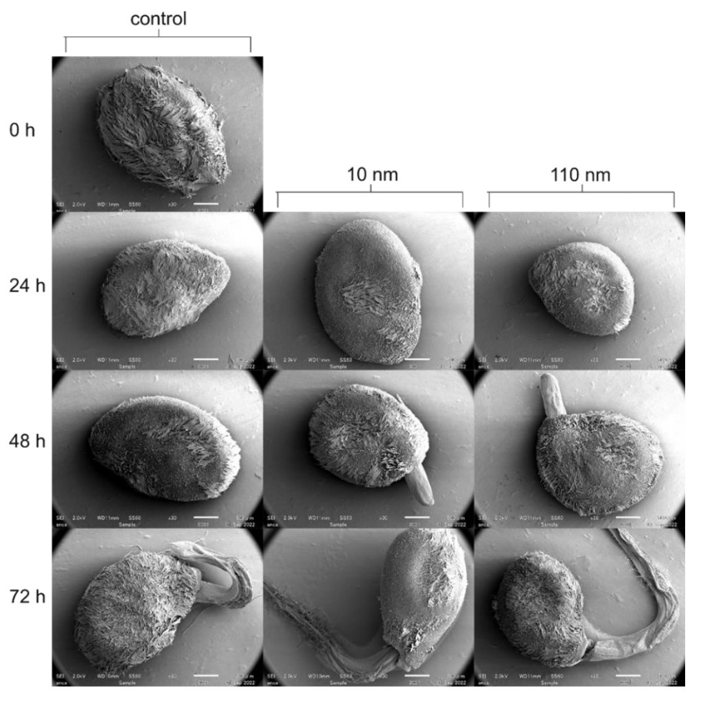 Scanning electron microscopy (SEM) revealed changes in the seed coat during germination, many of which were only observed in the presence of nanoparticles. Soil bacteria affect germination; specifically, Bacillus sp. may promote germination. The number of Bacillus sp. changed in the germination medium with SiNPs compared to the control. This suggested that these bacteria could interact with SiNPs to promote germination. 走査電子顕微鏡 (SEM)」を用いて、種皮の変化を観察し、微粒子を添加する場合にのみ、発芽中の種皮の変化が観察されたことがわかりました。また、土壌細菌「特にBacillus sp.」が発芽を促進する可能性があることも示されました。シリカ微粒子を含む発芽培地でBacillus sp.の数が変化したことから、これらの細菌がシリカ微粒子と相互作用して発芽を促進することが示唆されました。