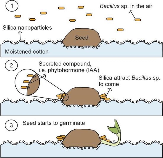 Bacteria (Bacillus sp.), which are found in the air, could interact with silica to promote germination … 空気中に浮遊する細菌 (Bacillus sp.) がシリカ微粒子と相互作用して発芽を促進する可能性があります。水稲などの植物は、シリカが必須ではないにもかかわらず、シリカに依存して生長することが知られています。