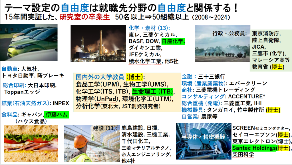 2024年4月に新たに加えた組織を紹介します。四人の修士と博士修了生は、食品プロセスの伊藤ハム、日産化学(化学業界でトップクラスの高収益企業)、光学機器のsantec Holdings、そしてインドネシアのバンドン工科大学の生命理工系の教員)に就職しました。標準偏差が高い研究室の卒業生が多様性に富んだことが証明されています。The organizations highlighted in green are new additions as of April 2024. The master’s and doctoral graduates have found employment at companies such as Itoham Foods Inc., Nissan Chemical Corp., Santec Holdings (optical instruments), as well as a faculty member at the School of Life Science and Technology at the Bandung Institute of Technology (ITB) in Indonesia. The high level of diversity in the employment of our lab’s graduates demonstrates the breadth of their capabilities.