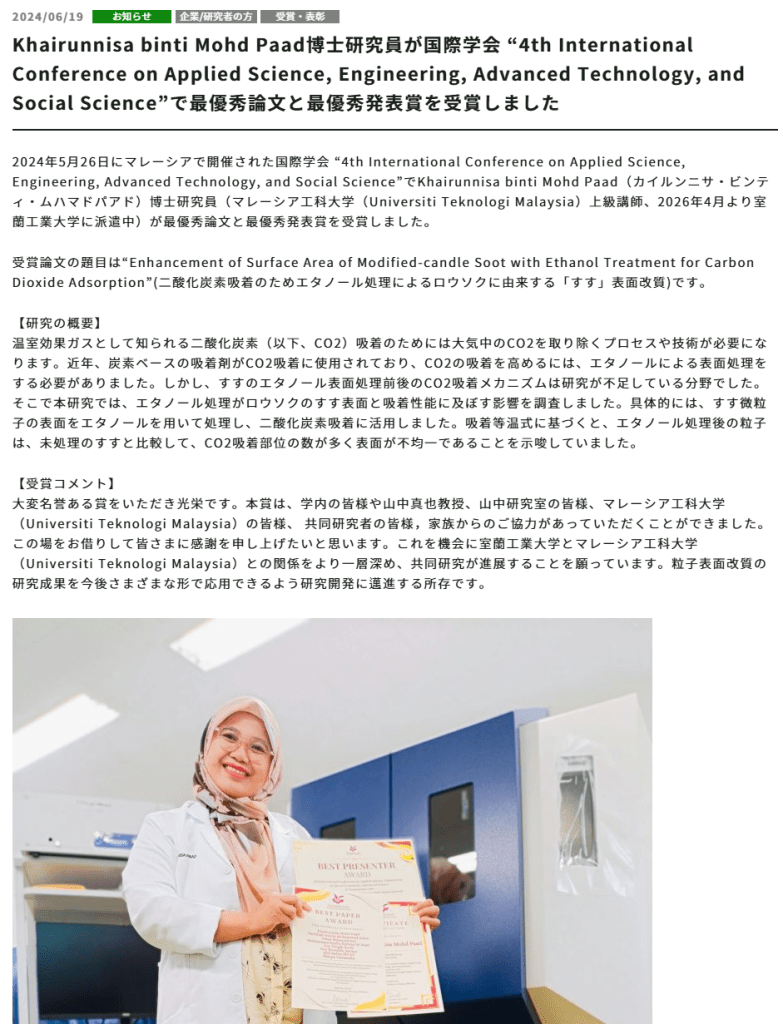 Dr. M. P. Khairunnisa (alumna, Senior Lecturer, Universiti Teknologi Malaysia, and also on assignment at Muroran Institute of Technology 2026/4-2027/3), received received the best paper and best presentation awards.