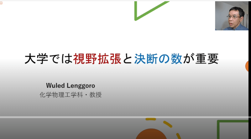 2025/4/ me.tuat.ac.jp で動画をみることができます >> ver. 2025/4 (Movie 30 min): 新入生科目「大学では視野拡張と決断の数が重要 “Expanding your horizons and the importance of making decisions in university” (in Japanese)
