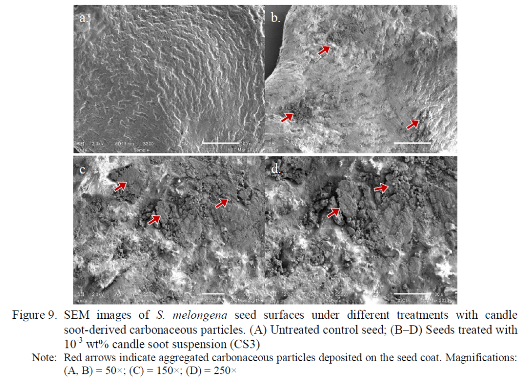 Building on our previous work, we discovered that soot particle not only accelerates germination but also plays a key role in water transport and starch-sugar metabolism. Seeds treated with a 10⁻³ wt% soot suspension germinated faster and showed improved seedling vigor. SEM imaging confirmed that soot particles form a thin hydrophilic layer on seed surfaces, enhancing moisture retention.