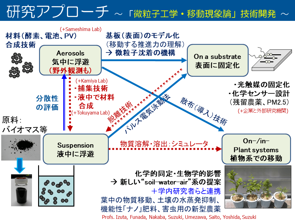 Our research or education is driven by the need for “Global Issues” on Energy, Food, and Society (Natural resource & Environmental impact) ~ such as (i) Materials processing (Particle synthesis technology, …); (ii) Technologies for Agricultural research (Plant growth system, Pesticide detector, …); (iii) Health-care/health-risk (Dispersing, measuring & capturing methods for particles in the gas-phase, …)