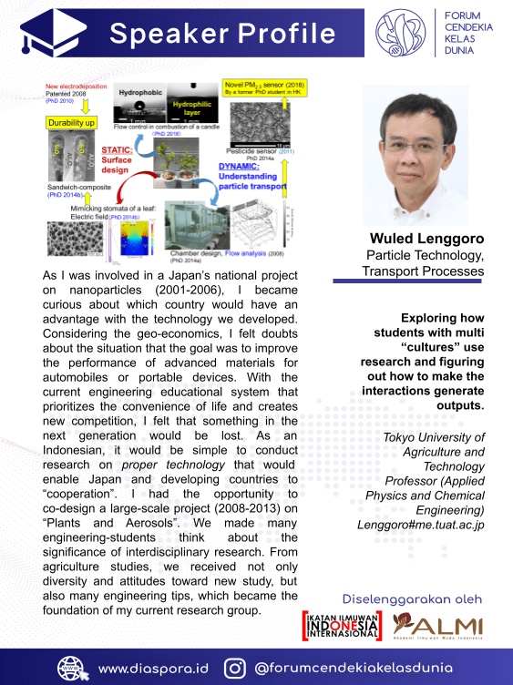 Wuled Lenggoro joined Tokyo University of Agriculture and Technology (TUAT) as a faculty member in 2007. Before that, he worked at Hiroshima University (HU) from 1998 to 2006. He left a university in Indonesia during his first year. He went to study in Japan with a World Bank fellowship. He obtained his degrees at HU. He has been a visiting fellow at Yale University (USA) and Lund University (Sweden). He also worked as a collaborative researcher at RIKEN and New Energy and Industrial Technology Development Organization (NEDO). Additionally, he served as a technical advisor for two multinational companies. He leads a research group at TUAT. The group operates under Japan’s first tenure-track program. He has supervised more than 20 doctoral students and over 50 master’s students or undergraduate final projects. He was a Regional Editor of the Journal of Nanoparticle Research (Springer). He also served as an Editor of the Journal of Aerosol Research (Japan Association of Aerosol Science & Technology JAAST). He has co-authored more than 120 refereed journal articles, 20 reviews, and 20 patents. He has received several awards. These awards include the “22nd APT Distinguished Paper Award” (2024, SPTJ/Elseveier). Another notable recognition is the “2nd Asian Young Aerosol Scientist Award” (2007, Asian Aerosol Research Assembly). He also received the “Chemical Engineering Science–Most Cited Paper 2003-2006 Award” (Elsevier). He also received the “Iinoya Award” (2005, JAAST). He was honored with the “Kanji Takahashi Award” (2013, 2020, JAAST). Another award is the “Measurement Award” (2016, JAAST). His research focuses on micro and global transport phenomena. He is particularly interested in how matter flows in “good” or “bad” particulate systems.