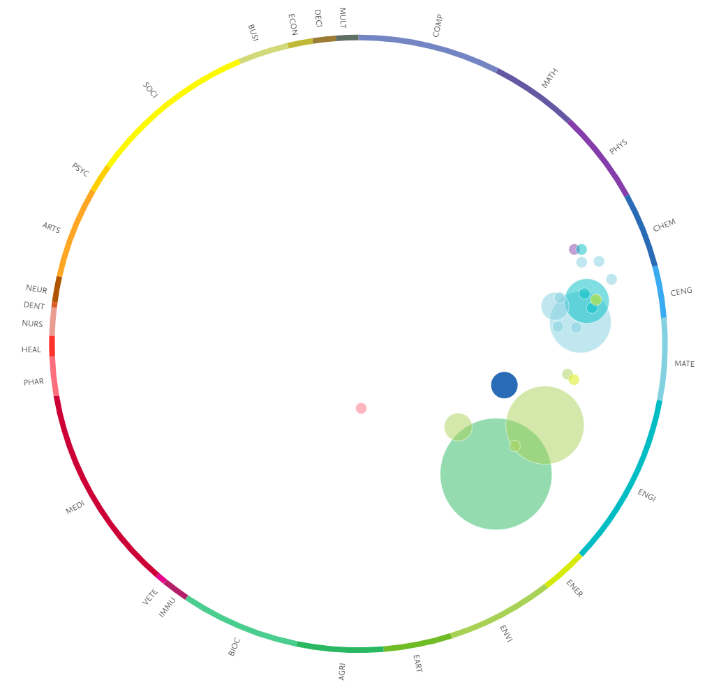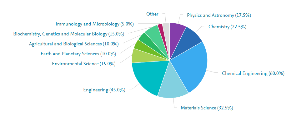 研究領域カテゴリー Research Area Categories (2007/1-2025/8, Web of Science, based on 64 articles in 41 Journals, TUAT Lenggoro Lab)
