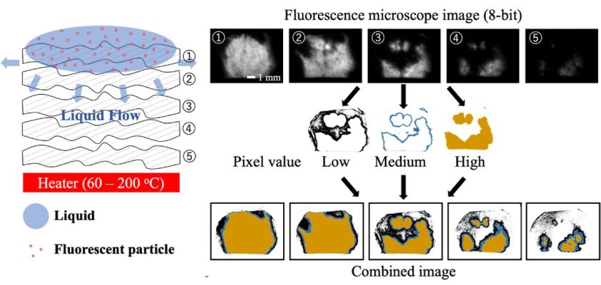蛍光微粒子で可視化する多孔質媒体中の液体輸送:** 蛍光微粒子を用いて多孔質媒体中の液体輸送を可視化する技術。 A technology for visualizing liquid transport in porous media using fluorescent particles.