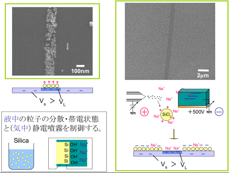 CE-NA: 帯電エアロゾルによるパターン化ナノ粒子集積技術 CE-NA: Charged Electrospray-assisted Nanoparticle Assembly on Patterned Substratesエレクトロスプレー(静電噴霧)で生成した帯電液中ナノ粒子を、電荷パターン化された基板(プラス/マイナス)上に選択的に堆積させる技術。金属(Au)および酸化物(SiO2)ナノ粒子(10-30 nm)の選択的堆積を実現。A technology for selectively depositing charged liquid-phase nanoparticles, generated by electrospray, onto electrically patterned (“plus/minus”) substrates. It enables selective deposition of metal (Au) and silica nanoparticles (10-30 nm).