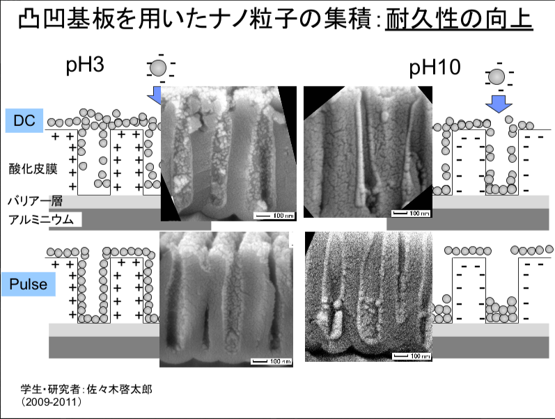 2008年発表のPEPD法を発展させ、水中の100nm以下の多孔性基板内部に粒子を固定化する世界初の技術。複合材料の耐久性向上に応用。 An evolution of the 2008 PEPD method, this world-first technology immobilizes particles within sub-100 nm porous structures of substrates in aqueous media. Applicable to improving the durability of composite materials (e.g., photocatalysts).