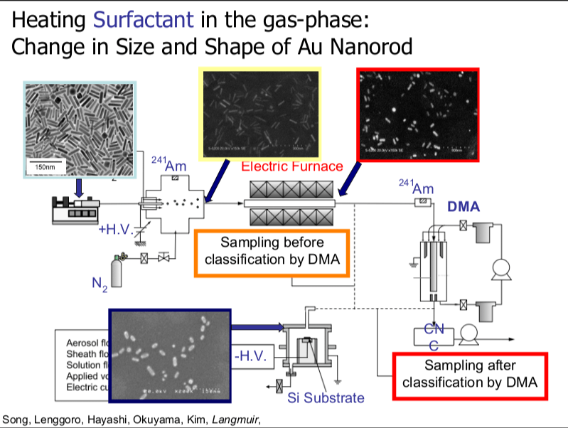 液中由来の単一ナノ粒子をエアロゾル化し、オンラインの加熱炉(管状炉)で飛行中に直接熱処理しながら、サイズを計測する世界初のシステム。それによって、物理的特性(例:融点、蒸発挙動、構成成分の変化)をリアルタイムで分析できる可能性が高い。従来の粒子収集・長時間分析を必要とするバルクな熱分析法では困難な、微粒子の「質」や組成変化を迅速かつin-situで評価することを可能にする。 The world's first system for direct, in-flight thermal analysis of individual nanoparticles originating from a colloidal dispersion. By measuring the size of the aerosolized liquid-phase nanoparticles and heating them online within a hot-wall tubular furnace during flight, it enables real-time analysis of their physical properties (e.g., melting point, evaporation behavior, compositional changes). This groundbreaking method allows for rapid, in-situ assessment of nanoparticle "quality" and compositional shifts, a feat challenging with conventional bulk thermal analysis requiring particle collection and lengthy analysis.