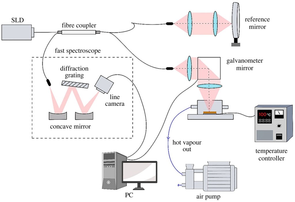 An SD-OCT (Optical Coherence Tomography) approach for “seeing” liquid transport inside a leaf-substrate during heating, observing two “transition points” in liquid behavior within heated biomass. >> More >> doi.org/10.1098/rsos.230150