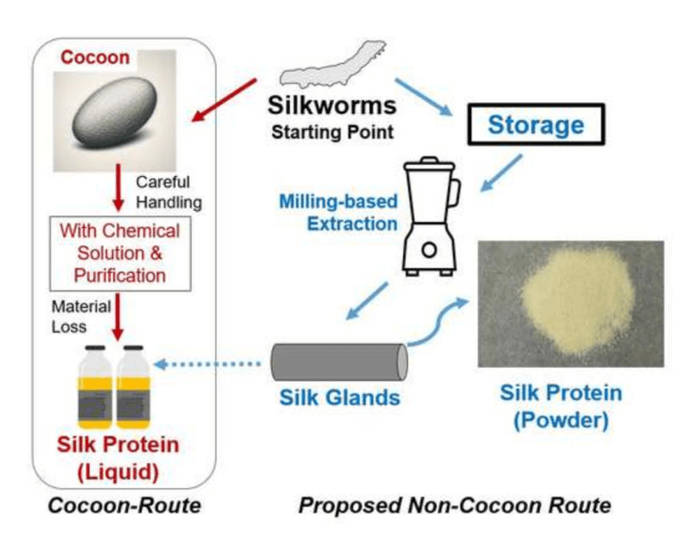 Obtaining silk & protein materials directly from silkworm – without the cocoon route (Patented)