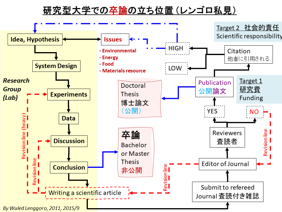 An opinion 大学では学ぶ人が主役。研究を「道具」とすることで、学生が成長するための効果的な学びが得られます。大学は組織的に学生の成長を支援します。研究室は学生が知識・スキル等を自分で生み出すための仕組みを提供するところです。文献や指導教員の助言は大切であるが、あくまでも手がかりに過ぎない。本当に「使える」知識・スキルは、学生自らの直接体験を通して得なければなりません。自転車の乗り方を「学習」するために、転びながら練習することが必要なのと同じです (WL, 2015)。(Other essays)In universities, students are the main actors. By using research as a “tool,” students can gain effective learning for their growth. Universities play a role in supporting student growth in an organized way. Research groups (labs) are where students can create knowledge and skills for themselves. While it is important to have reference materials and advice from supervisors, they are only clues. In order to actually use knowledge and skills, students must acquire them through direct experience. It is the same as practicing while falling down to learn how to ride a bicycle.
