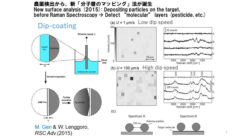 Nanoparticle sensor system for probing a dip-coated layer of organic molecules, at sub-100 nm resolution: 気中分散微粒子を用いたSERS法によって、表面上の分子「パターン」に対して直接「検査」可能な技術